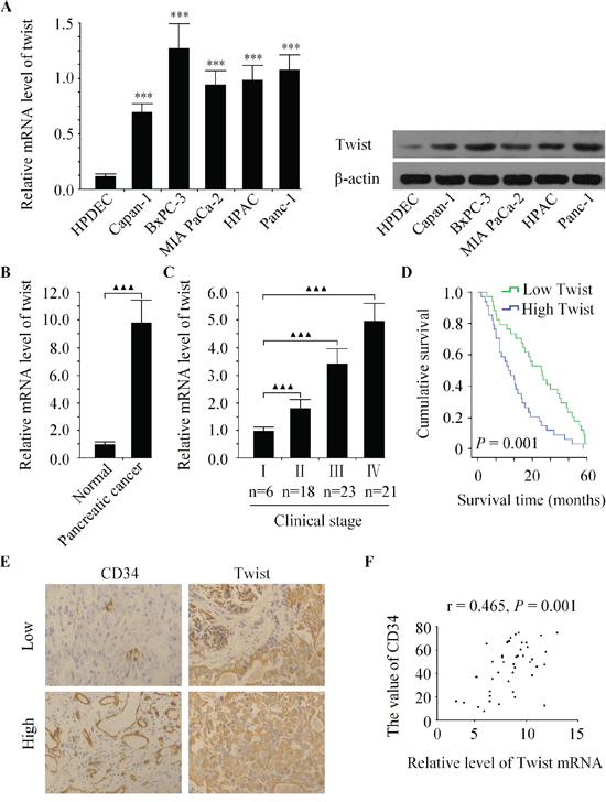 Figure 1: Twist is over-expressed and correlated with pancreatic cancer progression. A. The mRNA and protein expression of Twist were increased in five human pancreatic cancer cell lines compared to non-malignant pancreatic epithelial cell line HPDEC. B. Relative Twist expression was increased in pancreatic cancer tissues compared with the matched adjacent noncancerous tissues. C. Relative expression of Twist was positively correlated with clinical stages of pancreatic cancer. D. Kaplan-Meier curve of overall survival for patients whose pancreatic tumors expressed high or low levels of Twist. E. Representative images immunostained with antibody recognizing CD34 with low or high expression of Twist. F. Twist mRNA expression was positively correlated with MVD in pancreatic cancer tissues. ***P < 0.001 vs. HPDEC group, ▲▲P < 0.01, ▲▲▲P < 0.001.