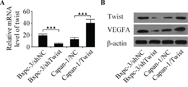 Figure 2: Analyze the expression of Twist and VEGFA in Bxpc-3 and Capan-1 cell lines. A. The expression of Twist mRNA was detected by qRT-PCR in pancreatic cancer cells infected with the LV-shTwist, LV-Twist or their matched negative controls. B. Western blot analysis of Twist and VEGFA in Bxpc-3 and Capan-1 cells after infection. Results are reported as the mean ± SD of four independent experiments, ▲▲▲P < 0.001.