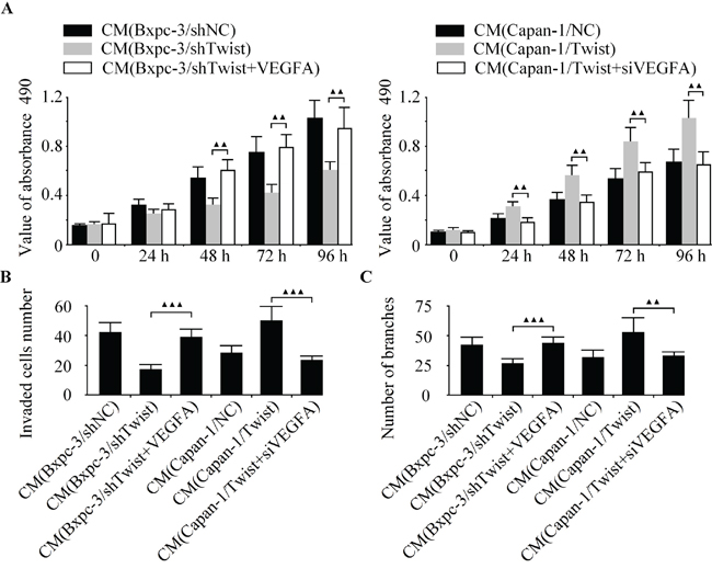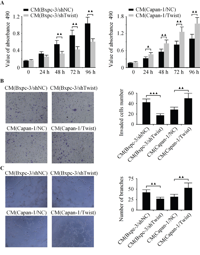 Figure 3: Effects of Twist on the cell growth, invasion and tubule formation of HUVECs in vitro. Bxpc-3 cells were infected with LV-shTwist to decrease the level of Twist, and Capan-1 cells were infected with LV-Twist to increase the expression of Twist. Then the media were collected as CM and applied to HUVECs. A. The cell growth of HUVECs was analyzed by CCK-8 assay. B. The cell invasion was examined by boyden chamber assay. C. The tubule formation of HUVECs was measured by capillary tube formation assay. The results are representative of three independent experiments, and the values are presented as the mean ± SD, ▲▲▲P < 0.001, ▲▲P < 0.01, ▲P < 0.05.