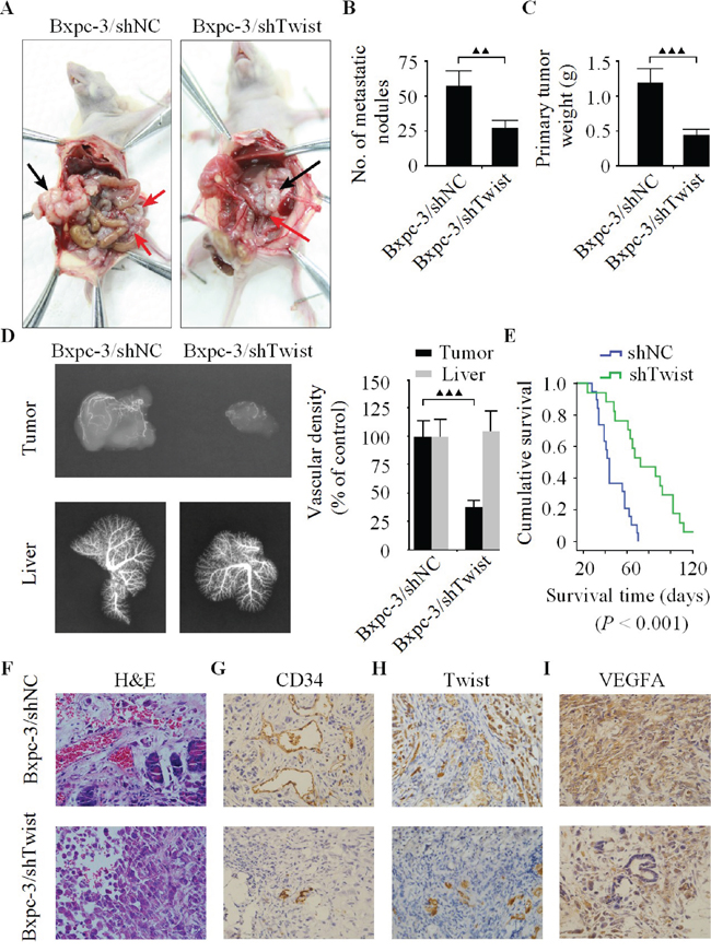 Figure 4: The down-regulation of Twist represses pancreatic cancer cell growth, metastasis and angiogenesis in vivo. A. Necropsy photographs of nude mice bearing pancreatic cancer showing therapeutic benefit of shTwist. The black arrows show the primary tumors, and the red arrows show the metastatic nodules. B. Number of metastatic nodules in the Bxpc-3/shTwist group was markedly less than Bxpc-3/shNC group. C. The primary tumor weights showed significant decrease in the Bxpc-3/shTwist group compared with Bxpc-3/shNC group. D. The vascular images of the tumors and livers were captured by X-ray machine after lead oxide-gelatin injection. E. The survival rate of the mice from Bxpc-3/shTwist group was significantly better than those of the Bxpc-3/shNC group (n = 19 for each group). H&E F. and immunohistochemistry for CD34 G., Twist H. and VEGFA I. protein expression in harvested tumors from tumor bearing nude mice (original magnification, ×400). Immunoreactivity towards all proteins were reduced in the Bxpc-3/shTwist group relative to their expression levels in the Bxpc-3/shNC group. Similar results were obtained in three independent experiments, ▲▲▲P < 0.001.