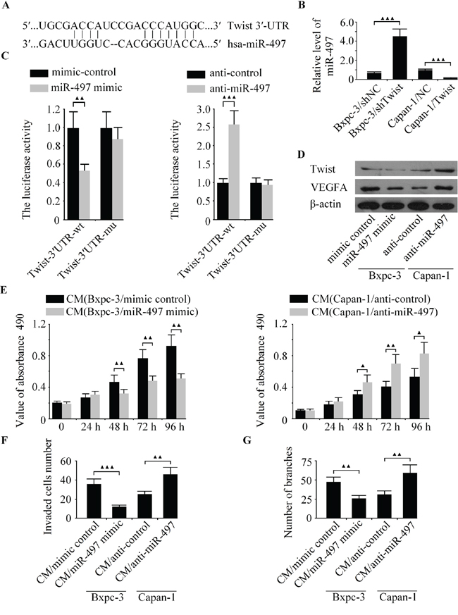 Figure 5: The expression of Twist was regulated by miR-497 directly. A. The miR-497 binding site in the 3′-UTR of Twist mRNA. B. The level of miR-497 was detected in Bxpc-3 and Capan-1 cells by qRT-PCR. C. The relative luciferase activity was measured in Bxpc-3 cells after co-transfection of Twist-3′UTR-wt or Twist-3′UTR-mu with miR-497 mimic, anti-miR-497 or appropriate controls. D. The protein levels of Twist and VEGFA was examined in Bxpc-3 and Capan-1 cells by western blot. Bxpc-3 cells were transfected with miR-497 mimic to increase the expression of miR-497, and Capan-1 cells were transfected with anti-miR-497 to decrease the level of miR-497. Then the media were collected as CM and applied to HUVECs. E. The cell growth capacity of HUVECs was analyzed by CCK-8 assay. F. The cell invasion was examined by boyden chamber assay. G. The tubule formation of HUVECs was measured by capillary tube formation assay. ▲▲▲P < 0.001, ▲▲P < 0.01, ▲P < 0.05.