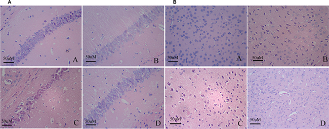Figure 3: Changes of neuronal pathomorphology in hippocampus and cortex (HE × 400, Scale bars = 50 μm). (A and B) Changes of neuronal pathomorphology in hippocampus and cortex (HE × 400, Scale bars = 50 μm), respectively. A: Young group; B: Elderly group; C: APP/PS1 group; D: Misoprostol-trearted group. The hippocampal and cortical neurons were in distinct and regular structure, and arranged densely and clearly in young group (Figure 3A). Elderly group revealed injuries including cell loss and karyopycnosis, and hyperchromatic nuclei in hippocampal and cortical neurons (Figure 3B). Compared to elderly group, APP/PS1 group revealed significant injuries including remarkable cell loss and karyopycnosis, and hyperchromatic nuclei in hippocampal and cortical neurons. Dead and dying cells in the injured hippocampi and cortex displayed necrosis, karyopycnosis and irregular contours (Figure 3C). Misoprostol-treated group significantly reduced injuries including cell loss and karyopycnosis, and hyperchromatic nuclei in hippocampal and cortical neurons (Figure 3D).