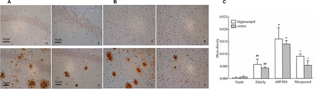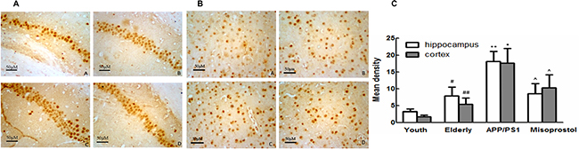 Figure 4: Changes of Aβ deposition in hippocampus and cortex (× 400, Scale bars = 50 μm). (A and B): Changes of Aβ deposition in hippocampus and cortex (× 400, Scale bars = 50 μm), respectively. A: Young group; B: Elderly group; C: APP/PS1 group; D: Misoprostol-trearted group. Both hippocampal and cortex Aβ deposition in elderly group distinctly increased compared with young group. Both hippocampal and cortex Aβ deposition in APP/PS1 group distinctly increased compared with elderly group. Misoprostol significantly reversed the increase of hippocampal and cortex Aβ deposition. (C) Group data showing the change of Aβ deposition. Data are expressed as mean ± SD of four individual experiments. #P < 0.05, compared with young group; *P < 0.05, compared with elderly group; ^P < 0.05, compared with APP/PS1 group.