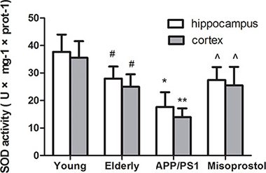 To confirm the effect of oxidative stress in AD, we tested SOD activity and MDA content in hippocampi and cortex. Both hippocampal and cortex SOD activity in elderly group distinctly decreased compared with young group. Both hippocampal and cortex SOD activity in APP/PS1 group distinctly decreased compared with elderly group. Misoprostol administration significantly reversed the decrease of SOD activity (Figure 5).