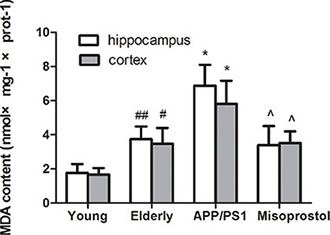 Both hippocampal and cortex MDA content in elderly group distinctly increased compared with young group. Both hippocampal and cortex MDA content in APP/PS1 group significantly increased compared to elderly group. Misoprostol administration significantly blunted the increase of MDA content in APP/PS1 mice (Figure 6).