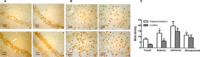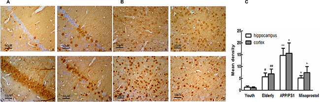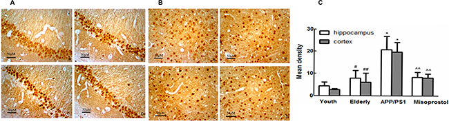 Immunohistochemistry was performed on brain sections to evaluate Aβ deposition. Young group exhibited less Aβ deposition both in the cortex and hippocampus neurons compared with elderly group. In APP/PS1 group, the Aβ positive plaques were distributed in intracellular and extracellular spaces in spherical or irregular shapes with different sizes. The Aβ deposition in the cerebral cortex and hippocampus in misoprostol-treated group was significantly lower than that in APP/PS1 group (Figure 4).