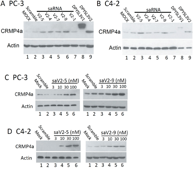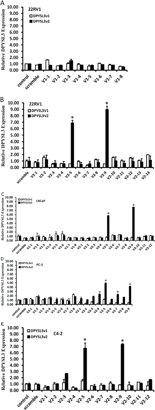 To enhance DPYSL3 gene expression, we utilized a recently invented small activating RNA (saRNA) approach. Multiple saRNA molecules were designed to target DPYSL3 promoters based on the criteria reported previously [17, 20]. The saRNA targeting sites were shown in Figure S2A and S2B, and their sense DNA sequences were listed in Table 2. Four different prostate cancer cell lines were used in screening active saRNAs with quantitative real-time PCR assays. A total of 8 saRNAs targeting the DPYSL3v1 promoter was tested but none of them had any significant enhancing effect on DPYSL3v1 expression (Figure 2A-2E). In contrast, 4 out of 14 saRNAs targeting the DPYSL3v2 promoter actively enhanced gene expression in different cell lines, especially two (saV2-5 and saV2-9) of these 4 saRNAs exerted dramatic enhancing effect in all cell lines tested (Figure 2A-2E). There was no cross effect observed between the promoter-specific saRNAs.
