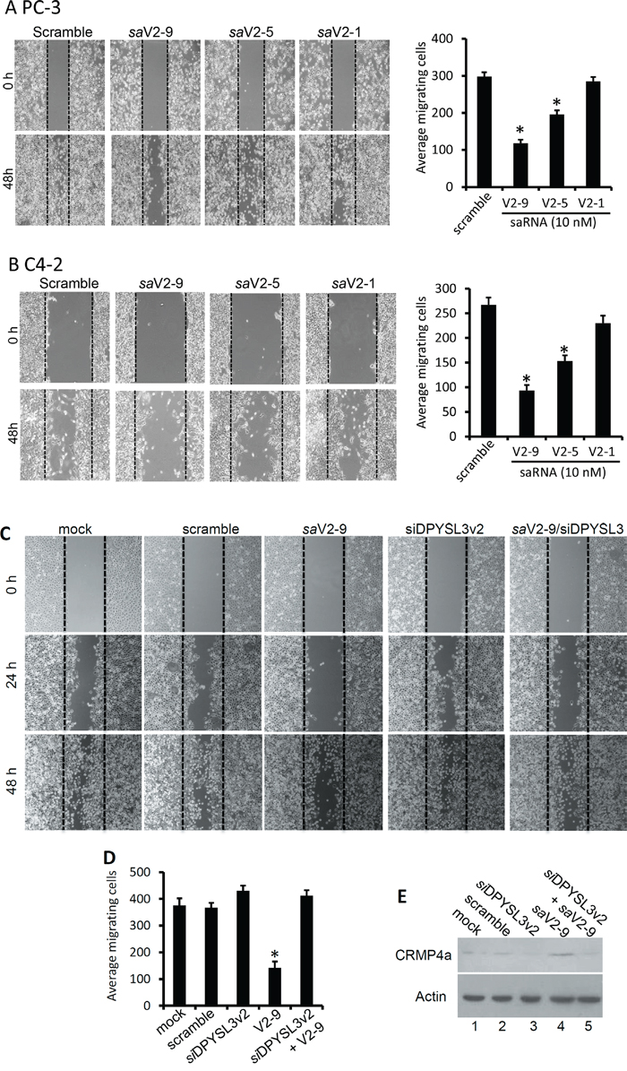 In this study, we screened a series of saRNA molecules targeting DPYSL3 gene promoter region and identified several saRNAs that could effectively enhance DPYSL3 gene expression at the transcription level via a promoter-dependent mechanism. Transfection of these saRNAs into prostate cancer cells significantly reduced cancer cell migration and invasion in vitro. Injection of these saRNAs conjugated with a prostate cancer-homing aptamer molecule dramatically suppressed distal metastasis of prostate cancer in a mouse orthotopic xenograft model.