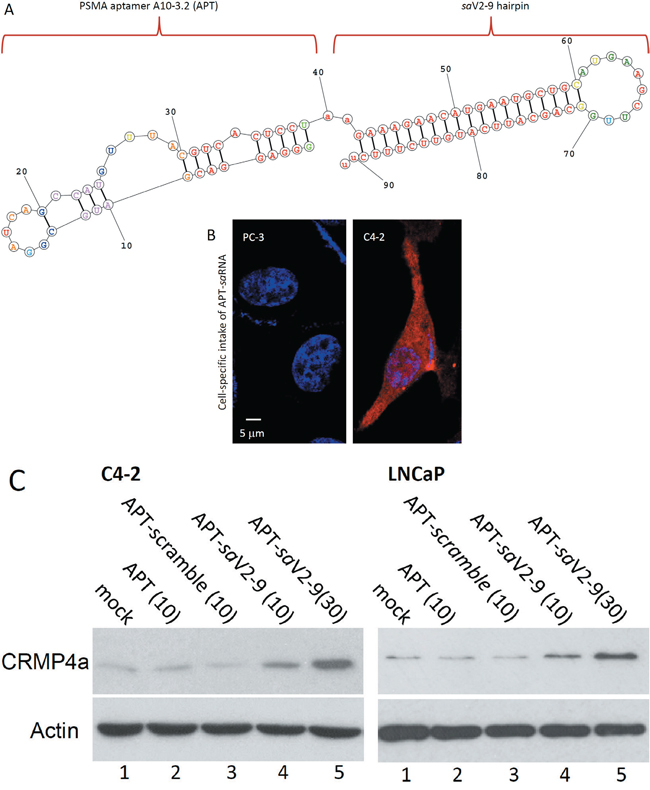 Successful delivery of therapeutic agents efficiently and specifically to the target tissue is desirable for treatment of human cancers [35]. Prostate specific membrane antigen (PSMA) is a well-known tumor antigen [36]. It is primarily expressed on the surface of prostate cancer epithelial cells and also is highly expressed in metastatic prostate cancer cells and the microvasculature of most studied tumors. This restricted expression pattern warranted it as a promising target for the diagnosis, detection, and management of prostate cancer. As such, PSMA has currently been used for molecular imaging, cancer vaccine development and targeted drug delivery in prostate cancers [37]. Particularly, an RNA-based aptamer targeting human PSMA was developed, which interacts specifically with the PSMA extra-cellular domain and has been widely used in targeted drug delivery and molecular imaging [31]. Recent reports defined two truncated PSMA aptamers with only 39-41mer in length but retraining the PSMA binding function [19, 32]. These truncated PSMA Aptamers make the chemical synthesis much easier to carry out and less non-specific binding [38]. In this study, we created a chimeric RNA molecule that the truncated A10-3.2 aptamer is conjugated to a hairpin-structured saRNA sequence. Consistent to previous reports from our group and others [32, 37, 39–41], A10-3.2 aptamer exerted a clean PSMA-specific cellular intake of the saRNA molecules in prostate cancer cells.