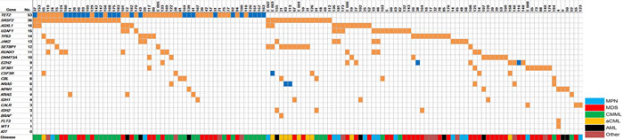 Figure 2: Distribution of mutations among 125 patients with detectable pathogenic variants. “No.” indicates the number of patients with detectable pathogenic somatic mutations. The color-coded disease type represents the suspected classification of the specific myeloid neoplasm after morphological evaluation and before comprehensive mutational profiling. If a patient shows two somatic mutations the box is colored in dark blue.