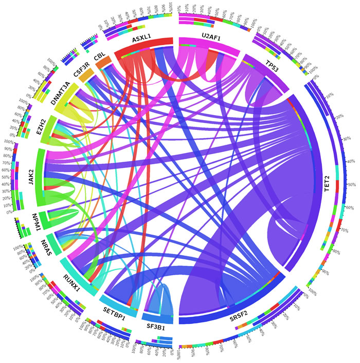 Figure 3: Circos diagram revealing concomitantly mutated genes. Shown are only those genes which were found to be mutated in at least five patients (out of 185 patients).