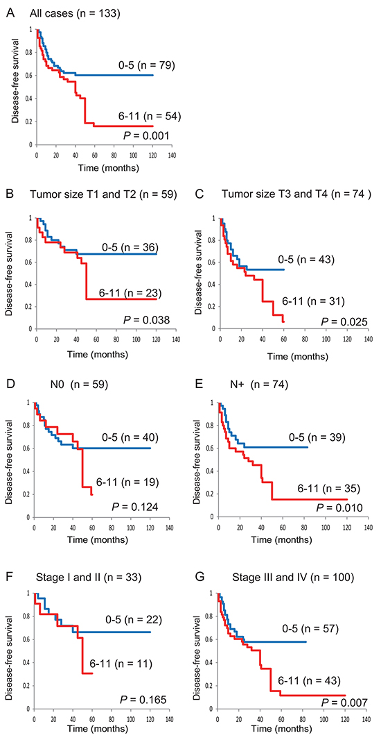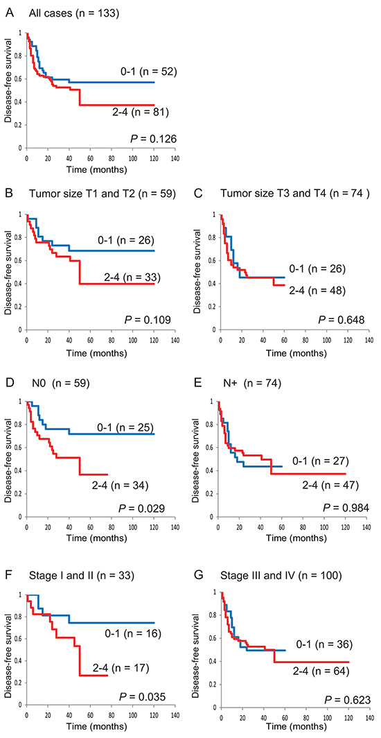 For the frequency analysis in the contingency tables, the associations between variables and methylation status were analyzed statistically using Fisher’s exact tests. The disease-free interval was measured from the date of treatment to the date when locoregional recurrence or distant metastasis was diagnosed. DFS probabilities were estimated by the Kaplan-Meier method, and the log-rank test was applied to assess the significance of differences among actuarial survival curves. Multivariate logistic-regression analysis considering age (70 and older vs. <70), sex, smoking status, stage (I, II vs. III, IV), and methylated genes was used to identify the predictive value of the prognostic factors. Cox’s proportional hazards regression analysis, which included age (70 and older vs. less than 70), sex, smoking status, stage (I, II vs. III, IV), and any methylated genes, was used to identify the multivariate predictive value of the prognostic factors [43, 44]. A significant difference was identified when the probability was less than 0.05. Statistical analyses were implemented in StatMate IV (ATMS Co., Ltd., Tokyo, Japan).