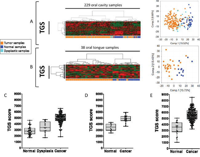 Figure 2: The tumor gene set (TGS) identified in the 4-NQO model of oral tumorigenesis is relevant to human disease and discriminates oral squamous cell carcinoma (OSCC) from normal mucosa samples. Hierarchical clustering and principal component analysis (PCA) using the TGS in: a set of 45 normal oral mucosa samples, 17 oral dysplasia, 167 OSCC (GSE30784) [22]. A. and a set of 12 normal tongue samples and 26 Oral Tongue SCC (OTSCC) (GSE9844) [21] B. Enrichment scores (ES) were computed for the TGS in GSE30784 C., GSE9844 (D), and in the TCGA set of 221 OSCC and 24 normal oral mucosa samples (E). Statistical significance was given by a Mann Whitney test D and E. or a Kruskal-Wallis test (C). We observed a significant difference (P<0.0001) between ES of normal, dysplastic and tumor samples in all datasets.