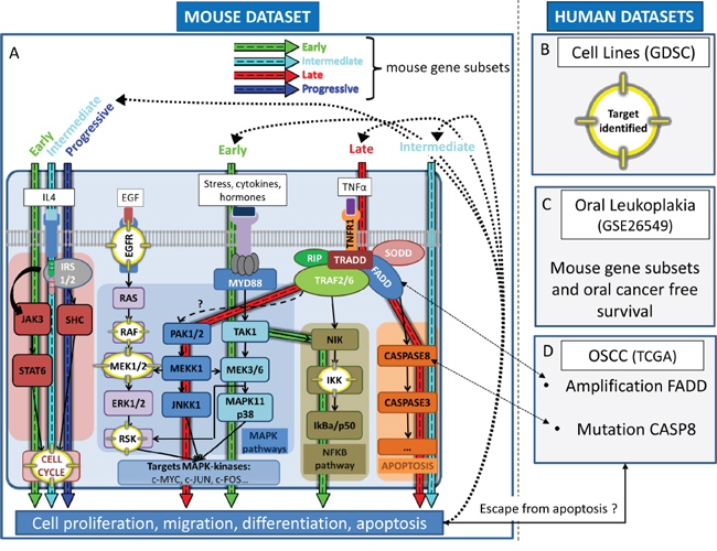Figure 6: Overview of the dynamic expression changes observed in the 4-NQO model projected in pathways pertinent to human oral preneoplasia (OPL) and squamous cell carcinoma (OSCC). This figure shows the coherence between main molecular events occurring in the 4-NQO mouse model (EGS, IGS, LGS, PGS) and those involved in human oral preneoplasia and OSCC. Mitogen-activated protein kinase (MAPK), apoptosis, cell cycle, and the nuclear factor NF-κB (NFKB) pathways are dysregulated during oral tumorigenesis and were found to be correlated (p<0.01) with one or more of mouse gene subsets as indicated by blue (PGS), green (EGS), red (LGS) and turquoise (IGS) arrows respectively (A). Those correlations were consistent with drug sensitivity patterns in established squamous cell carcinoma cell lines; corresponding targets are highlighted (yellow) within the pathways A, B. Patients whom OPL were enriched for the mouse EGS were at increased risk of developing OSCC (borderline statistical significance) C. OSCC enriched for the mouse TGS harbor genomic features (amplification region 11q13) that may be associated with increased sensitivity to MEK1/2 inhibitors D. Abbreviations: TCGA: The Cancer Genome Atlas; GDSC: Genomics of Drug Sensitivity in Cancer; EGS: Early Gene Subset; IGS: Intermediate Gene Subset; LGS: Late Gene Subset; PGS: Progressive Gene Subset.
