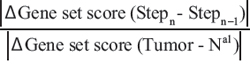 The single-sample GSEA (ssGSEA) projection tool from GenePattern [50] was used to compute separate enrichment scores (ES) for each sample of a given dataset using defined gene sets i.e. TGS, IGS, LGS, PGS subsets and BioCarta pathways from the Molecular Signature Database (MSigDB database v4.0 updated May 31, 2013; v4.02 released Jan 18, 2014, ref 20). The gene expression values for a given sample are rank-normalized, and an ES is produced using the empirical cumulative distribution functions of the genes in the gene set and the remaining genes [19, 20]. When UP and DN versions of a gene set are available, a combined score was computed. A rate of ES was computed for early (EGS), intermediate (IGS), late (LGS) and progressive (PGS) gene sets at each step of oral tumorigenesis: from “normal to hyperplasia” (H->N), from “hyperplasia to dysplasia” (D->H), and from “dysplasia to tumor” (T->D), using the following formula: