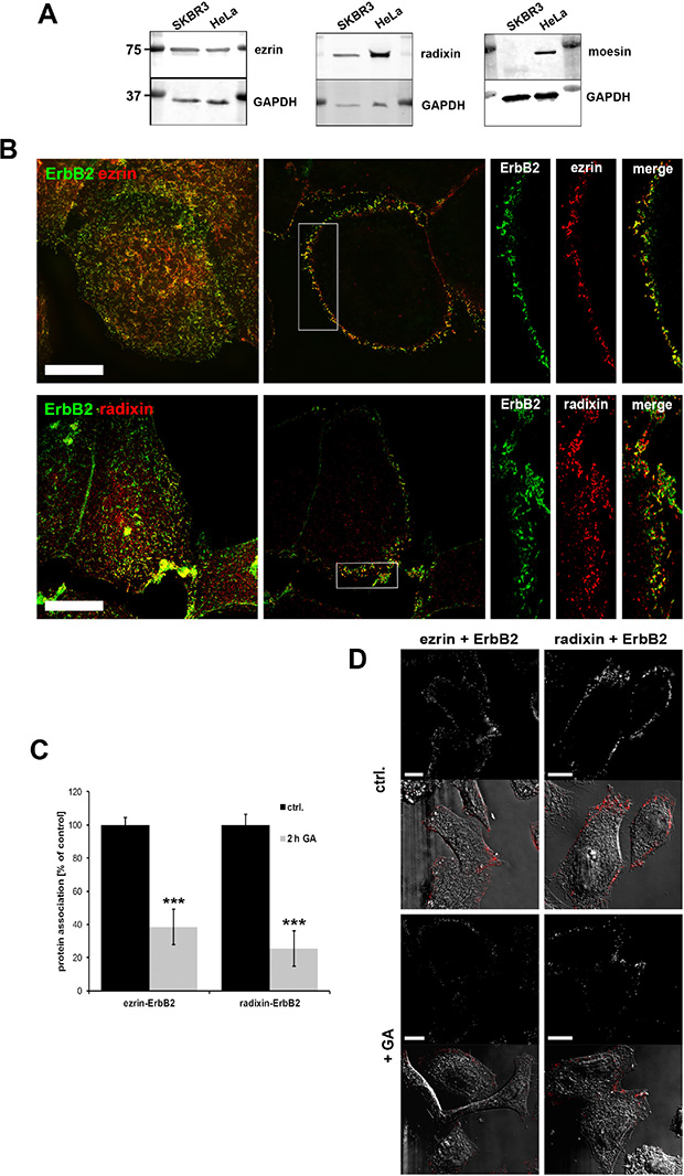 Figure 1: ERM expression and localization in SKBR3 breast cancer cells. (A) Western blot analysis of ERM levels in SKBR3, HeLa and PC3 cells. SKBR3 breast cancer cells do not express moesin. (B) Colocalization of ezrin/radixin and ErbB2 in SKBR3 cells. 3D-SIM of fixed cells, stained for endogenous ERM and ErbB2, shows a high degree of colocalization between the ezrin/radixin and ErbB2 at the plasma membrane (left panel: max. projection; middle: single plane section; right: single channels of insert). Scale bars: 10 μm. (C) Analysis of protein association in SKBR3 cells by proximity ligation assay (PLA). 2 h treatment with 3 μM GA leads to decreased association of ezrin/ErbB2 and radixin/ErbB2. Data is represented as mean +/− SEM (***P < 0.001). (D) Corresponding single plan section of a representative PLA experiment. Fluorescence and DIC pictures of control cells (upper panel) and cell treated for 2 h with geldanamycin (lower panel) are shown. Scale bars: 10 μm.