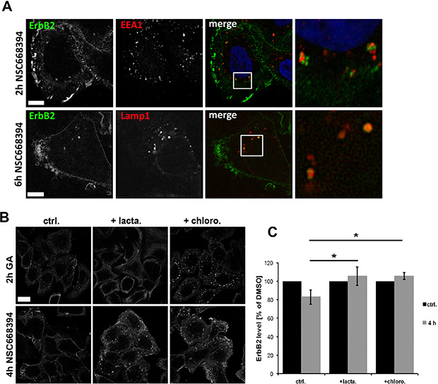 Figure 6: Analysis of intracellular sorting of ErbB2 by confocal microscopy. (A) ErbB2 localization with EEA1 and Lamp1 after ERM inhibition. Cells were treated for 2 h or 6 h with NSC668394 and subsequently fixed and stained for ErbB2 and EEA1 or Lamp1. ERM inhibition leads to ErbB2 internalization and association to the endosomal marker EEA1 at early time points and association Lamp1-possitive vesicles at later time points. Scale bars: 10 μm. (B) Cells were pretreated for 2 h with 10 μM of lactacystin or chloroquine, followed by a 2 h treatment with 3 μM geldanamycin (GA) or 4 h with 30 μM of NSC668394. Afterwards, cells were fixed and stained for ErbB2. Lactacystin inhibits the uptake of ErbB2 triggered by GA but not by NSC668394. Chloroquine pretreatment leads in GA and NSC668394 treated cells to an intracellular accumulation of ErbB2 to vesicular structures. Scale bar: 10 μm. (C) Quantification of ErbB2 protein levels after lactacystin and chloroquine treatment. Cells were treated as described in (B), lysed and analyzed by SDS-PAGE. Treatment of cells with lactacystin or chloroquine inhibits degradation of internalized ErbB upon ERM inhibition by NSC668394. Data is shown as mean +/− SEM (*P < 0.05).