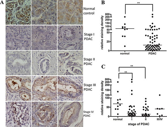Figure 1: Netrin-1 expression is decreased in early-stage PDAC samples. (A) Netrin-1 immunohistochemical staining (ab122903, Abcam) in normal pancreatic tissue and stage I–IV pancreatic ductal adenocarcinoma (PDAC). Three representative graphs of each stage are shown (200×). The dashed circles show representative acini that are positive for netrin-1 staining in the normal pancreatic tissue. It is difficult to observe the acinar cells and netrin-1 staining in the stage I and II PDAC samples. The ductal expression of netrin-1 becomes evident in stage III and IV PDACs. (B) Statistical analyses of the netrin-1 expression level in the normal pancreatic tissues (N = 10) and the total PDAC tumors (N = 61) on the immunostained tissue array (**P < 0.01). The line refers to the group median. (C) Stage-specific analysis of netrin-1 expression in the PDAC samples (N = 30 for stage I, N = 24 for stage II, and N = 7 for stages III/IV) compared with that in the normal pancreas tissues (N = 10) on the immunostained tissue array (*P < 0.05, **P < 0.01). The line refers to the group median.