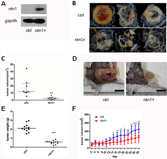 Figure 2: Netrin-1 inhibits the growth of MiaPaCa II xenograft tumors. (A) Netrin-1 over-expression in MiaPaCa II cells was determined by western blotting with an anti-Netrin-1 antibody (sc-9292, Santa Cruz Biotechnology). Control (ctrl) cells were infected with a retrovirus without the netrin-1 CDS insertion, and GAPDH was used as an internal control. (B) Xenograft tumors of the control MiaPaCa II cells (ctrl) and netrin-1-over-expressing cells (ntn1+) in a chicken chorioallantoic membrane (CAM) model (bar, 1 mm). (C) Statistics for the size of the CAM xenograft tumors formed by the control cells (N = 8) and netrin-1-over-expressing cells (N = 10). The lines refer to the median size of each group (***P < 0.001). (D) Xenograft tumors formed by the control (ctrl) and netrin-1-over-expressing MiaPaCa II cells (ntn1+) in the SCID-beige mice (bar, 1 cm). (E) Statistics for the weights of the xenograft tumors formed by the control (N = 12) and netrin-1-over-expressing cells (N = 12). The lines refer to the median weight of each group (***P < 0.001). (F) The growth curve of the mouse xenograft tumors formed by the netrin-1-over-expressing cells (N = 9) showed significant growth arrest compared with that of the control xenografts (N = 8). Volume of xenograft tumors on both chicken CAMs and mice was calculated using the formula v = 0.5 ab2 (a: long diameter, b: short diameter). (error bars represent the standard deviation of the measurements, *P < 0.05, **P < 0.01, ***P < 0.001).
