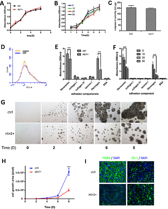 Figure 3: Netrin-1 suppresses ECM adhesion and the 3D growth of MiaPaCa II cells but does not affect proliferation and apoptosis in 2D cultures. (A–B) Growth curve analysis of 2D-cultured netrin-1-over-expressing (ntn1+) and control (ctrl) MiaPaCa II cells (A) or MiaPaCa II cells treated with the indicated concentrations (ng/ml) of recombinant netrin-1 (B). No significant differences in cell proliferation were observed following either netrin-1 over-expression or recombinant netrin-1 protein treatment (P > 0.05). (C–D) Analysis of caspase-3 activity (C) and TUNEL assay (D) of the netrin-1-over-expressing (ntn1+) and control MiaPaCa II cells (ctrl). No significant differences in apoptosis were observed in either assay. (E–F) Quantification of the adhesion of the control (ctrl) and netrin-1-over-expressing (ntn1+) MiaPaCa II cells (E) or MiaPaCa II cells pretreated with the indicated concentrations (ng/ml) of recombinant netrin-1 for 24 hr (F) to the designated ECM components (***P < 0.001). (G–H) Micrographs (G) and growth curves (H) of the control (ctrl) and the netrin-1-over-expressing (ntn1+) MiaPaCa II cells cultured in 3D in Matrigel for 8 days (magnification, 200×; bar, 50 μm) (***P < 0.001). (I) Immunohistochemical staining of integrin β4 (ITGB4) and ZO-1 in the mouse xenograft tumor sections from the control (ctrl) and netrin-1-over-expressing (ntn1+) MiaPaCa II cells (magnification, 200×).