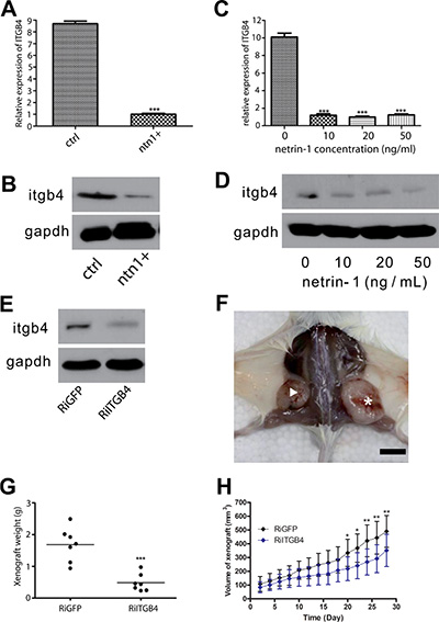 Figure 4: Netrin-1 inhibits PDAC growth by decreasing integrin β4 expression. (A–B) Real-time RT-PCR (A) and western blotting (B) analyses of integrin β4 expression in control (ctrl) and netrin-1-over-expressing MiaPaCa II cells (ntn1+). GAPDH was used as the internal control for both analyses. (C–D) Real-time RT-PCR (C) and western blotting (D) analyses of integrin β4 expression in MiaPaCa II cells treated with the indicated concentrations of netrin-1 for 48 hr. GAPDH was used as the internal control for both analyses. (E) Western blotting analysis of integrin β4 expression in control GFP RNAi (RiGFP) and ITGB4 RNAi (RiITGB4) MiaPaCa II cells. GAPDH was used as the internal control. (F) Representative xenograft tumors formed by GFP RNAi (asterisk) and ITGB4 RNAi (arrowhead) MiaPaCa II cells in SCID-beige mice (bar, 1 cm). (G) Statistics for the weights of the xenograft tumors formed by the control RiGFP (N = 7) and RiITGB4 (N = 7) MiaPaCa II cells (***P < 0.001) in SCID-beige mice. (H) Growth curves of the RiGFP and RiITGB4 MiaPaCa II xenograft tumors in Balb/c NU/NU mice. The tumor volumes were measured every other day and calculated using the formula v = 0.5 ab2 (a: long diameter; b: short diameter); the total 28-day result is shown (error bars represent the standard deviation of the measurements, *P < 0.05, **P < 0.01).