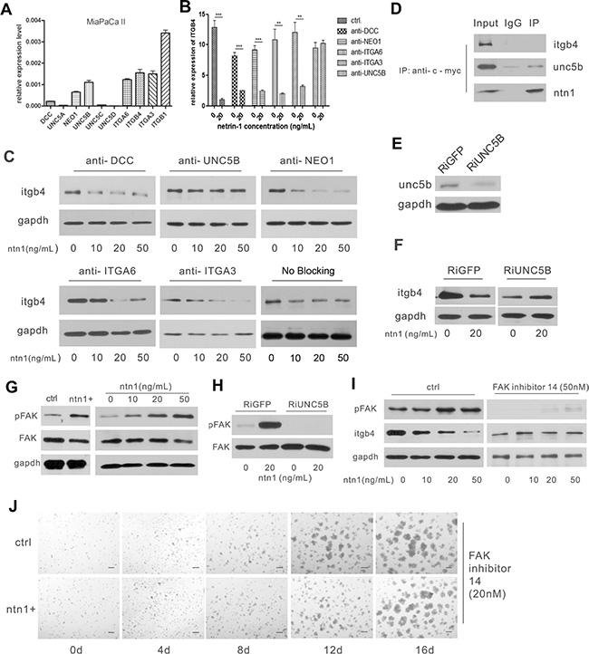 Figure 5: Netrin-1 down-regulates integrin β4 expression through the UNC5b receptor and the activation of FAK. (A) Real-time PCR analysis for the expression of netrin-1 receptors in MiaPaCa II cells. GAPDH was used as an internal control. (B–C) The anti-UNC5b antibody selectively blocks the integrin β4-suppressing effect of netrin-1. The receptors on the MiaPaCa II cells were blocked by their respective antibodies before the cells were treated with the indicated concentrations netrin-1; integrin β4 expression in the cells was then detected by real-time RT-PCR (***P < 0.001, **P < 0.01) (B) and western blotting (C). GAPDH was used as an internal control. (D) Netrin-1 interacts with UNC5b but not integrin β4 in the myc-netrin-1-over-expressing MiaPaCa II cells. An anti-myc antibody to pull down the myc-tagged netrin protein in the netrin-1-over-expressing MiaPaCa II cells, followed by immunoblotting analysis of the integrin β4 (itgb4), UNC5b and netrin-1 (ntn1) levels in the precipitate. (E) Western blotting analysis of UNC5b expression in the UNC5B RNAi (RiUNC5B) and control GFP RNAi (RiGFP) MiaPaCa II cells. (F) Netrin-1 suppresses integrin β4 expression in the control GFP RNAi cells but not the UNC5B RNAi cells. Unc5b-knockdown and control MiaPaCa II cells were treated with recombinant netrin-1, and the integrin β4 expression was detected before and after netrin-1 treatment by western blotting. (G) Western blotting analysis of the FAK and phospho-FAK levels in the netrin-1-over-expressing MiaPaCa II cells, and the MiaPaCa II cells treated with the indicated concentrations of recombinant netrin-1 for 2 hr. The vector-transfected and the untreated MiaPaCa II cells were used as the respective negative controls, and GAPDH was used as an internal control. (H) UNC5b RNAi abrogates netrin-1-induced FAK phosphorylation. The FAK and phospho-FAK levels in the control and UNC5b RNAi MiaPaCa II cells were detected before and after netrin-1 stimulation by western blotting. (I) FAK inhibition abrogates the netrin-1-induced down-regulation of integrin β4. Western blot analysis of the phospho-FAK and integrin β4 levels in MiaPaCa II cells treated with the indicated concentrations of recombinant netrin-1 in the presence or absence of FAK inhibitor 14. (J) FAK inhibition abrogates the netrin-1-induced growth arrest of MiaPaCa II cells in Matrigel, as analyzed by the 3D growth of the control and netrin-1-over-expressing MiaPaCa II cells in Matrigel in the presence of 20 nM FAK inhibitor 14. Scale bars, 50 μm.