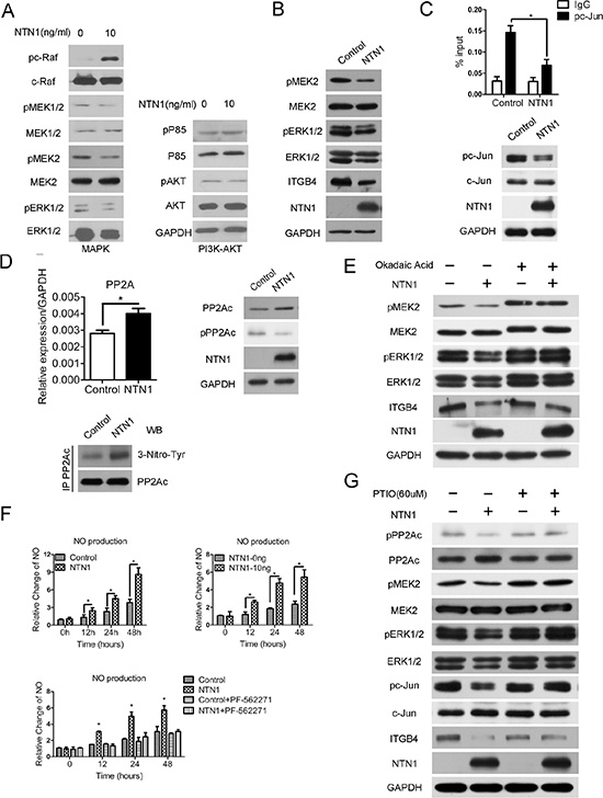 Figure 6: Netrin-1 induces nitric oxide (NO)-stimulated PP2A activation and suppresses the MAPK pathway to down-regulate integrin β4 expression. (A) The western blotting analysis of the MAPK pathway (C-RAF/MEK/ERK) and PI3K-AKT pathway in the netrin-1-treated MiaPaCa II cells shows that MEK/ERK signals in the MAPK pathway were reduced and the PI3K-AKT pathway was unchanged. (B) Western blotting assay showing reduced MEK/ERK signals and decreased integrin β4 expression in the netrin-1-over-expressing MiaPaCa II cells. (C) A ChIP analysis (upper panel) and western blotting assay (below panel) of the phosphorylated c-Jun (pc-Jun) levels in the netrin-1-over-expressing MiaPaCa II cells showed reduced pc-Jun levels and decreased pc-Jun recruitment to the integrin β4 gene promoter upon netrin-1 over-expression. (*P < 0.05). (D) RT-PCR and western blotting assay showing increased PP2A expression and decreased phosphorylation and enhanced 3-nitrotyrosine modification of PP2A in the netrin-1-over-expressing MiaPaCa II cells. (*P < 0.05). (E) A western blotting assay of the netrin-1-over-expressing MiaPaCa II cells treated with the PP2A inhibitor okadaic acid showed that the repression of MEK/ERK signaling and integrin β4 expression depends on PP2A activation. (F) NO production was increased in the netrin-1-over-expressing and recombinant netrin-1-treated MiaPaCa II cells. FAK inhibitor PF-562271 blocks the netrin-1-induced NO production. (*P < 0.05). (G) Western blotting assay of the netrin-1-over-expressing MiaPaCa II cells treated with the NO scavenger PITO. The NO scavenger abolished the netrin-1-induced changes in PP2A expression and phosphorylation, the MEK/ERK signals, c-Jun phosphorylation and integrin β4 expression. GAPDH was used as an internal control for all western blotting assays.
