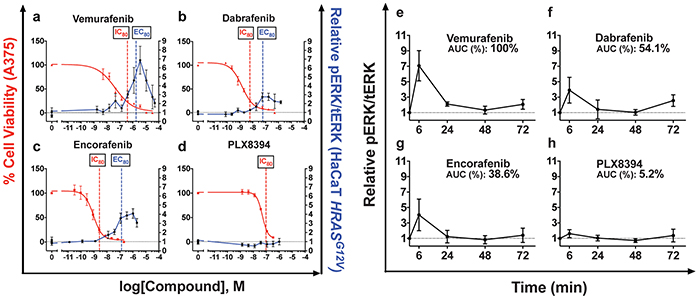Four distinct BRAFi were profiled for paradoxical ERK activation across a range of inhibitor doses effective against the BRAF mutant melanoma cell line A375 in vitro. The immortalized BRAF wild-type human keratinocyte cell line HaCaT, stably expressing HRASG12V [27], was used to model cutaneous epidermal keratinocytes susceptible to paradoxical ERK activation, since this occurs most prominently in the context of mutant RAS. HaCaTHRASG12V cells were exposed to drug for 15 minutes and ERK activation was measured by quantitative western blotting for phosphorylated ERK (pERK) normalized to a total ERK loading control (tERK) (Figure 1a–1d). To compare ERK activation profiles against the effect of melanoma growth inhibition, cell viability at 72 hours with the BRAF mutant cell line A375 was assessed in parallel (Figure 1). EC80 values for pERK/tERK induction were determined by a four parameter logistic model.