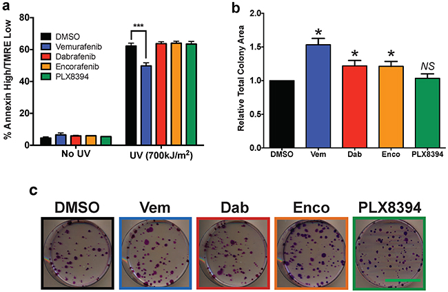 Figure 2: Paradoxical ERK activation and apoptosis suppression profiles are consistent with differences in proliferation. a. Apoptosis 24 hours after 700J/m2 UV-irradiation of HaCaTHRASG12V cells measured with AnnexinV/TMRE FACs. Only vemurafenib treatment induced significant apoptosis suppression. b–c. Colony growth assay after 12 days of continual drug treatment, quantified by total colony area (ImageJ), showed strong growth advantage for vemurafenib and a detectable advantage with encorafenib and dabrafenib versus control. Scale bar on representative images is 5 cm. All statistical tests were two-tailed, unpaired Student’s t-tests. Summary parameters for each compound are compiled in Table 1. (*p<0.05; *** p<0.001; NS = not significant, n≥3 for all data points).