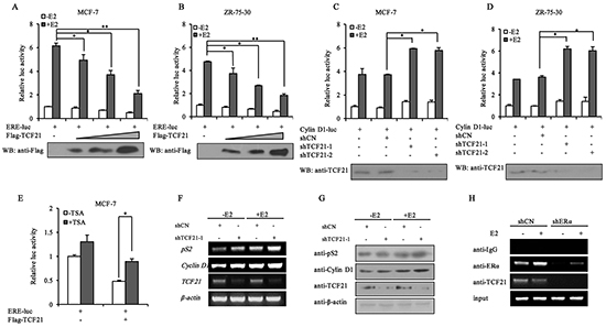 Figure 2: Effect of TCF21 on the transcriptional activity of ERα. A–B. MCF-7 and ZR-75-30 cells were transfected with ERE-luciferase and Flag-TCF21. Luciferase activity was detected either with or without pre-treatment of the cells with 10 nM E2 for 16 h. For comparison, the ERE-luc activity level of control cells was set to 1. ‘*’ and ‘**’ indicate significantly different from cells transfected with ERE-luc only at the P<0.05 and P<0.01 level, respectively. C–D. MCF-7 and ZR-75-30 cells were transfected with Cyclin D1-luciferase and shCN, shTCF21-1 or shTCF21-2. Luciferase activity was detected with or without pre-treatment of the cells with 10 nM E2 for 16 h. For comparison, the Cyclin D1-luc activity level of control cells was set to 1. ‘*’ indicates significantly different from cells transfected with Cyclin D1-luc and shCN at the P<0.05 level. E. MCF-7 cells were transfected with ERE-luc and Flag-TCF21. Luciferase activity was detected either with or without 10 nM TSA for 20 h. For comparison, the ERE-luc activity level of control cells was set to 1. ‘*’ indicates significantly different from cells treated with TSA at the P<0.05 level. F. MCF-7 cells were transfected with shTCF21-1. Cells pre-treated with or without 10 nM E2 for 16 h were subjected to PCR to measure the mRNA levels of pS2 and Cyclin D1. G. MCF-7 cells transfected with shTCF21-1 were treated with or without 10 nM E2 for 16 h. The samples were subjected to Western blot analysis with the indicated antibodies. H. ChIP experiment showing the binding of TCF21 and ERα to ERE of the pS2 promoter in MCF-7 cells. MCF-7 cells transfected with shERα were treated with or without 10 nM E2 for 16 h. The cells were subjected to IP with anti-IgG, anti-ERα, or anti-TCF21 antibody. All experiments were repeated at least three times. Data are the means ± SDs of three independent experiments.