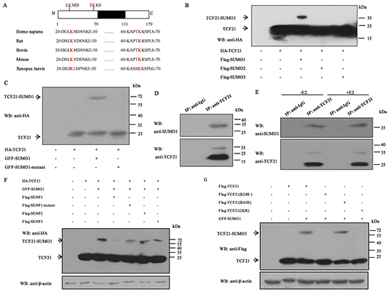 Figure 3: Sumoylation of TCF21. A. Schematic representation of the primary structures of TCF21 and the predicted sumoylation sites along with the structures of TCF21 in different species. B. HEK 293T cells transfected with HA-TCF21 and Flag-SUMO1, 2 or 3 were subjected to Western blot with anti-HA antibody. C. HEK 293T cells co-transfected with GFP-SUMO1 or GFP-SUMO1 mutant and HA-TCF21 were subjected to Western blot with anti-HA antibody. D. HEK 293T cells were subjected to IP using anti-TCF21 antibody or anti-IgG antibody followed by Western blot using anti-SUMO1 or anti-TCF21 antibody. E. MCF-7 cells treated with or without E2 were subjected to IP with anti-TCF21 antibody followed by Western blot with anti-SUMO1 antibody. F. HEK 293T cells were transfected with different combinations of constructs as indicated, followed by Western blot with anti-HA antibody. No NEM was added in the cell extracts. G. HEK 293T cells were transfected with Flag-tagged wild-type or mutant TCF21(K24R, K65R or 2KR) and GFP-SUMO1, and individual cell extracts were subjected to Western blot with anti-Flag antibody. All experiments were repeated at least three times.