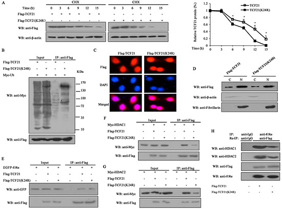 Figure 4: Effect of sumoylation on the half-life of TCF21, subcellular localization and its interaction with ERα and HDAC1/2. A. MCF-7 cells transfected with Flag-tagged wild-type or mutant TCF21(K24R) were treated with 10 mg/ml CHX at the indicated time periods. Cell lysate was subjected to Western blot assay. The graph shows the relative intensity of the TCF21 band at different time points. The level of TCF21 protein in control cells was set to 1. Data shown in the graphs are the means ± SDs of three independent experiments. ‘*’ indicates significantly different from cells transfected with mutant TCF21 (K24R) at the P<0.05 level. B. HEK 293T cells transfected with Myc-Ub and Flag-tagged wild-type TCF21 or mutant TCF21(K24R) were collected, and then subjected to IP using anti-Flag antibody followed by Western blot with anti-Myc or anti-Flag antibody. C. MCF-7 cells transfected with Flag-tagged wild-type or mutant TCF21(K24R) were stained with rabbit anti-Flag antibody (red) and then counterstained with DAPI (blue) for nucleus detection. D. MCF-7 cells were transfected with Flag-tagged wild-type or mutant TCF21(K24R). Cytosolic and nuclear fractions were subjected to Western blot using anti-Flag antibody. Fibrillarin and β-actin were measured to monitor the efficiency of nuclear and cytosolic preparations, respectively. E. HEK 293T cells transfected with EGFP-ERα and Flag-tagged wild-type or mutant TCF21(K24R) were collected, and then subjected to IP using anti-Flag antibody followed by Western blot with anti-GFP or anti-Flag antibody. F. HEK 293T cells transfected with Myc-HDAC1 and Flag-tagged wild-type or mutant TCF21(K24R) were collected, and then subjected to IP using anti-Flag antibody followed by Western blot with anti-Myc or anti-Flag antibody. G. HEK 293T cells transfected with Myc-HDAC2 and Flag-tagged wild-type or mutant TCF21 (K24R) were collected, and then subjected to IP with anti-Flag antibody followed by Western blot with the anti-Myc or anti-Flag antibody. H. MCF-7 cells transfected with Flag-tagged wild-type or mutant TCF21(K24R) were subjected to IP using anti-ERα antibody and re-IP with anti-Flag antibody followed by Western blot with anti-HDAC1, anti-HDAC2, anti-Flag or anti-ERα antibody.