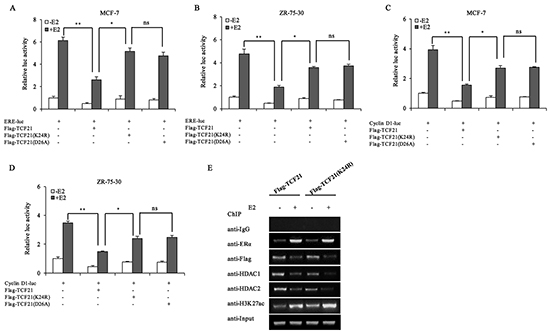 Figure 5: Effect of TCF21 sumoylation on the transcriptional activity of ERα. A–B. MCF-7 and ZR-75-30 cells were transfected with the indicated plasmids. Luciferase activity was detected either with or without pre-treatment of the cells with 10 nM E2 for 16 h. For comparison, the ERE-luc activity level of control cells was set to 1. ‘**’ indicates significantly different from cells transfected with ERE-luc and Flag-TCF21 at the P<0.01 level. ‘*’ indicates significantly different from cells transfected with ERE-luc and mutant TCF21 (K24R) at the P<0.05 level. ‘ns’ indicates not significant. C–D. MCF-7 and ZR-75-30 cells were transfected with Cyclin D1-luc, Flag-TCF21, Flag-TCF21 (K24R), or Flag-TCF21(D26A). Luciferase activity was detected either with or without pre-treatment of the cells with 10 nM E2 for 16 h. For comparison, the level of Cyclin D1-luc activity in control cells was set to 1. ‘**’ indicates significantly different from cells transfected with Cyclin D1-luc and Flag-TCF21 at the P<0.01 level. ‘*’ indicates significantly different from cells transfected with Cyclin D1-luc and mutant TCF21(K24R) at the P<0.05 level. ‘ns’ indicates not significant. E. MCF-7 cells were transfected with Flag-tagged wild-type TCF21 or mutant TCF21(K24R). Cells pre-treated with or without 10 nM E2 for 16 h were subjected to ChIP to examine the recruitment of ERα, TCF21, HDAC1/2 and acetyl-H3K27 to the pS2 promoter. All experiments were repeated at least three times. Each bar represents the mean ± SDs of three independent experiments.