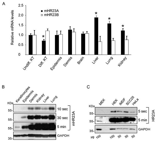 Figure 1: Expression of mHR23 and hHR23 proteins. A. mRNA was isolated from primary undifferentiated (Undiff. KT) or differentiated (Diff. KT) 3-day keratinocyte cultures, or from the indicated tissues harvested from 2-d-old CD-1 mice. mHR23A and mHR23B mRNA levels were assessed by qPCR, and normalized to the abundance of Rpl16 and Rps29 transcripts. The results are expressed as the mean + SEM (n=3), relative to mRNA abundance in undifferentiated keratinocytes, which is set to 1.0. The asterisks indicate P<0.05, relative to abundance in undifferentiated keratinocytes (ANOVA). B, C. The abundance of mHR23A or hHR23A was determined in protein lysates from the tissues harvested in (A) or from the indicated cultured cells. Glyceraldehyde-3-phosphatase (GAPDH) was used to normalize for protein loading. MEK and HEK indicate, respectively, primary cultures of undifferentiated mouse and human epidermal keratinocytes. Blot exposure times and the amount of protein on the blots (in μg) are indicated, to better illustrate differences in protein abundance.