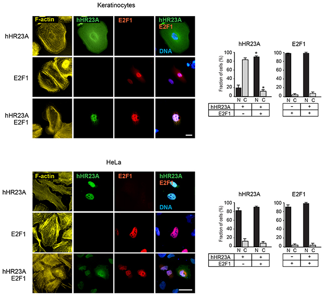 Figure 3: Modulation of hHR23A subcellular distribution by E2F1. Primary keratinocytes or HeLa cells were transfected with vectors encoding the indicated proteins, and 24 h later were processed for immunofluorescence microscopy using the indicated antibodies. The histograms represent the average fraction of cells with nuclear (N) or cytoplasmic (C) protein distribution + SEM (n=4). At least 100 transfected cells per condition were scored in each experiment. The asterisks indicate P<0.05, relative to cells transfected with single vectors (ANOVA). F-actin and DNA were visualized, respectively, with phalloidin and Hoescht 33342. Bar, 25 μm.
