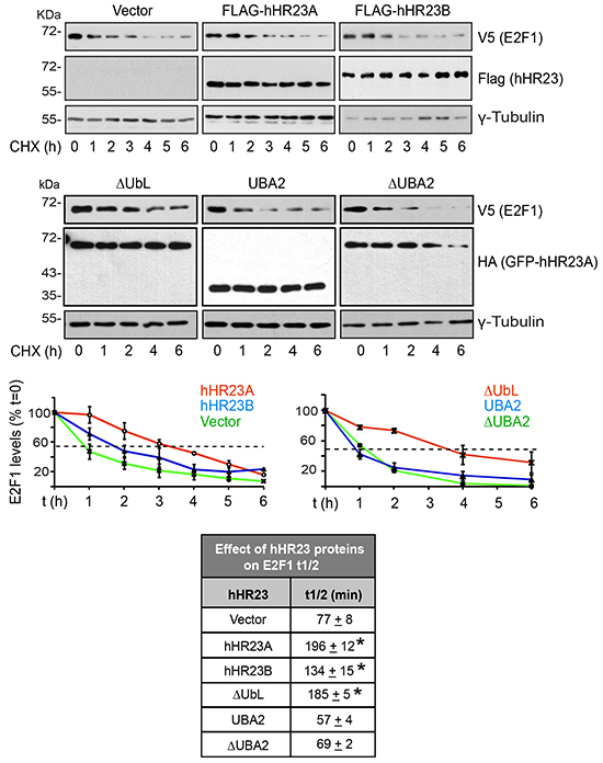 Figure 6: Modulation of E2F1 t½ by hHR23 proteins. Primary undifferentiated keratinocytes were cotransfected with vectors encoding V5-tagged E2F1 and the indicated FLAG- or HA-tagged hHR23 proteins. Twenty-four hours after transfection, cycloheximide (CHX, 100 μg/ml, final) was added to the culture medium, and cell lysates were prepared at the indicated time intervals thereafter. The lysates were analyzed by immunoblot with the indicated antibodies, and γ-tubulin was used to normalize for protein loading. The graphs represent the mean ± SD of E2F1 levels quantified in replicate immunoblots generated from lysates prepared from three independent cell isolates, and were used to calculate E2F1 t½ (mean±SD, n=3) in the presence of each hHR23 protein, as summarized in the chart. The asterisks indicate P<0.05 relative to E2F1 t½ in the absence of any exogenous hHR23 protein (ANOVA).