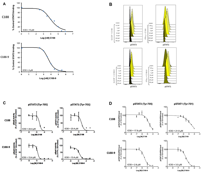 Figure 2: Inhibition of STAT3 activities by C188 and C188-9. A. Inhibition of recombinant STAT3 (200nM) binding to Biacore sensor-chip-immobilized phosphododecapeptide ligand (12 amino acids surrounding and including pY1068 within EGFR) by C188 (0.1 to 1000 μM, top) and C188-9 (0.1 to 1000 μM, bottom) by SPR. The equilibrium binding levels obtained ± compound were normalized (resonance obtained in the presence of compound ÷ the resonance obtained in the absence of compound x 100) and plotted against Log [nM] C188 (or C188-9) and IC50 calculated (value shown in inlay). B. Inhibition of ligand-stimulated STAT phosphorylation, measured by phosphoflow. Serum-starved (1 hour) Kasumi-1 cells, pre-incubated with compound/DMSO (1 hour), were treated with G-CSF (10 ng/ml, 15 min, left two panels) or IFN-γ (10ng/ml, 15 min, right panel). Cells were permeabilized and stained with Alexa647-pSTAT3, and PE-pSTAT1 antibodies and analyzed on BD LSR2. FCS files were uploaded to Cytobank for pSTAT3 and pSTAT1 quantitation. Histograms depicting pSTAT3 and pSTAT1 levels are shown. C. Mean fluorescence (pSTAT3/1) levels were plotted as function the Log [M] compound, and IC50 calculated using GraphPad. 1D shows IC50 curve from representative experiments. D. Inhibition of ligand-stimulated STAT phosphorylation, measured by Luminex. Serum-starved (1 hour) Kasumi-1 cells, pre-incubated with compound/DMSO (0/0.1/0.3/1/3/10/100 μM, 1 hour), were treated with G-CSF (10 ng/ml, 15’). Total protein extracts of cells were assayed for pSTAT3, pSTAT1, and GAPDH levels by Luminex. GAPDH-normalized pSTAT3 or pSTAT1 values were divided by this ratio for untreated cells and expressed in percentage. These values were plotted as a function of Log [M] compound, and IC50 values calculated using GraphPad. Upper panel shows data from representative experiments with C188 and lower panel shows those with C188-9.