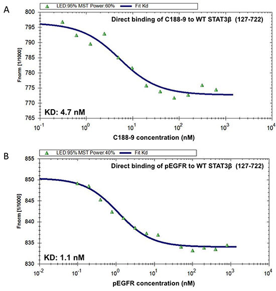 Figure 3: C188-9 binds to STAT3 with high affinity. Increasing concentrations of C188-9 (0.305 to 10,000 nM; panel A.) and the phosphotyrosyl (pY)-dodecapeptide based on the portion of the EGFR surrounding Y1068 (EGFR pY-1068; 0.025 to 800 nM; panel B.) were incubated with a constant concentration (80 nM) of fluorescently labeled STAT3 (aa residues 127-722). Fluorescence was measured continuously before and after application of an infrared laser. The change in fluorescence (Fnorm) was calculated from the ratio of fluorescence immediately before heating and 30 seconds after heating and plotted against the logarithm of the different concentrations of C188-9 or EGFR pY-1068 (A and B); the sigmoidal binding curve was used to calculate the dissociation constant KD.