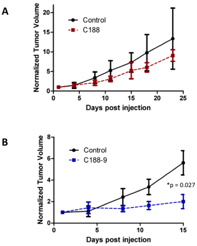 UM-SCC-17B cells (1.5 × 106) were injected into the tongues of athymic, 8–10 week old, male, nude mice (NCI, Frederick, MD, USA). Once tumors were established, mice (20 total; 10/group) were randomized (average tumor vol ~ 15 – 20 mm3) to receive 5 times a week, intraperitoneal injections of either DMSO or C188 (50 mg/Kg) or C188-9 (100 mg/Kg). Tumor volumes were measured twice weekly. Average tumor volumes 6/π x (long dimension) x (short dimension)2) were calculated and normalized to the volume at first day of treatment and plotted Comparison was done by t test (* p<0.05).