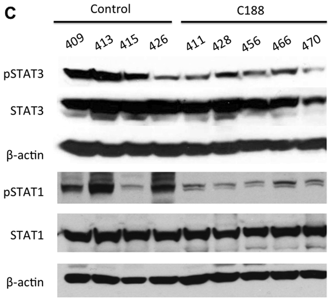 Student’s t-test or a paired t-test was used to compare control- and C188-9 treated groups as indicated.