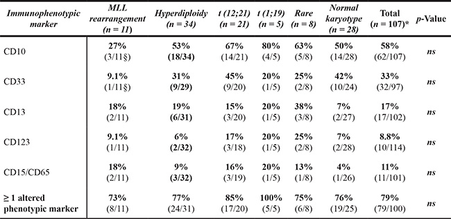 *The total of patients was 107 because there were 11 cases with missing data concerning genetic alterations. § p-value < 0.05, vs. patients without MLL gene rearrangements.