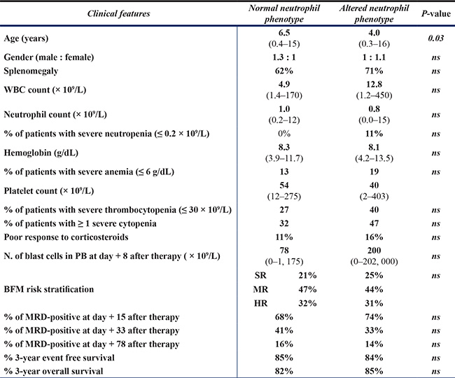 Here we investigated the presence and the frequency of altered patterns of expression of neutrophil-associated proteins in BM- and PB-derived maturing/mature neutrophils from children with BCP-ALL studied at diagnosis, and their potential relationship with tumor cytogenetics and the clinical behavior of the disease.
