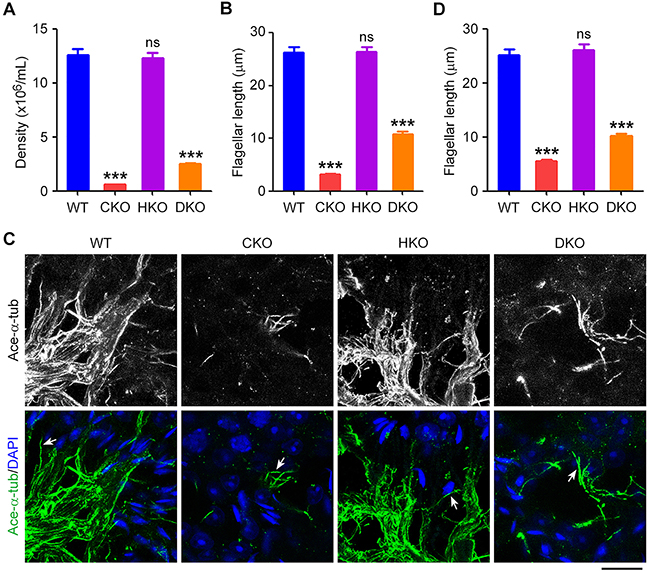 Figure 2: Sperm flagellar defects induced by loss of Cyld are partially rescued by deletion of Hdac6. A. and B. Quantification of the density (A) and flagellar length (B) of sperm isolated from WT, CKO, HKO, and DKO mice. C. Immunofluorescence images of sperm flagella in the testis of mice, stained with acetylated α-tubulin (ace-α-tub) antibody and DAPI. Arrows indicate representative flagella. Scale bar, 15 μm. D. Experiments were performed as in C, and the flagellar length was quantified. ***P < 0.001; ns, not significant. Data are represented as mean ± SEM.