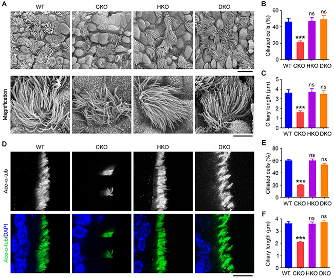 Figure 3: Cyld/Hdac6 DKO mice are protected from ciliary defects in the tracheal epithelium. A. Scanning electron microscopy images of cilia in WT, CKO, HKO, and DKO mouse tracheal epithelia. Scale bars, 3 μm. B. and C. Experiments were performed as in A, and the percentage of ciliated cells (B) and ciliary length (C) were quantified. D. Immunofluorescence images of tracheal epithelial cilia in WT, CKO, HKO, and DKO mice, stained with acetylated α-tubulin (ace-α-tub) antibody and DAPI. Scale bar, 5 μm. E. and F. Experiments were performed as in D, and the percentage of ciliated cells (E) and ciliary length (F) were quantified. ***P < 0.001; ns, not significant. Data are represented as mean ± SEM.