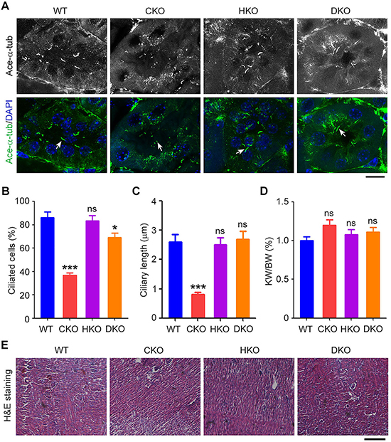 Figure 4: Cyld/Hdac6 DKO abrogates Cyld loss-induced ciliary defects in the kidney. A. Immunofluorescence images of renal cilia in WT, CKO, HKO, and DKO mice, stained with acetylated α-tubulin (ace-α-tub) antibody and DAPI. Arrows indicate representative cilia. Scale bar, 10 μm. B. and C. Experiments were performed as in A, and the percentage of ciliated cells (B) and ciliary length (C) were quantified. D. Statistical analysis of the kidney weight (KW)/body weight (BW) ratio for WT, CKO, HKO, and DKO mice. E. Images of hematoxylin/eosin (H & E) stained renal tissues of WT, CKO, HKO, and DKO mice. Scale bar, 10 μm. *P < 0.05, ***P < 0.001; ns, not significant. Data are represented as mean ± SEM.