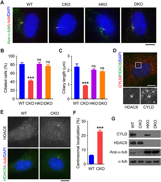 Figure 5: Cyld loss-induced ciliary defects in mouse embryonic fibroblasts (MEFs) are significantly rescued by deletion of Hdac6. A. Immunofluorescence images of WT, CKO, HKO, and DKO MEFs serum-starved for 48 hours and stained with acetylated α-tubulin (ace-α-tub) and γ-tubulin (γ-tub) antibodies and DAPI. Scale bar, 8 μm. B. and C. Experiments were performed as in A, and the percentage of ciliated cells (B) and ciliary length (C) were quantified. D. Immunofluorescence images of WT MEFs serum-starved for 48 hours and stained with CYLD and HDAC6 antibodies and DAPI. The boxed area is shown in a higher magnification at the bottom. Scale bar, 8 μm. E. Immunofluorescence images of WT and CKO MEFs serum-starved for 48 hours and stained with HDAC6 and γ-tubulin (γ-tub) antibodies and DAPI. Scale bar, 8 μm. F. Experiments were performed as in E, and the percentage of HDAC6 localized at the centrosome/basal body was quantified. G. Western blot analysis of CYLD, HDAC6, acetylated α-tubulin (ace-α-tub), and α-tubulin (α-tub) in lysates from WT, CKO, HKO, and DKO MEFs. ***P < 0.001; ns, not significant. Data are represented as mean ± SEM.