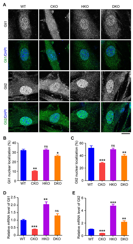 Because the CYLD/HDAC6 axis is involved in ciliary homeostasis [13], and ciliary assembly is required for the Shh signaling [31], we next assessed the Shh pathway in WT, CKO, HKO, and DKO MEFs. MEFs were cultured in serum-free medium for 24 hours, followed by treatment with conditioned serum-free medium containing the amino-terminal domain of Shh (ShhN) for 24 hours. Cells were then stained with antibodies directed against Gli1 and Gli2, two key transcriptional regulators of the Shh signaling [31]. We found that loss of Cyld dramatically reduced the proportion of Gli1 and Gli2 in the nucleus, but deletion of Hdac6 did not significantly affect nuclear localization of these two proteins (Figures 6A–6C). In contrast, in DKO MEFs, the impaired nuclear localization of Gli1 and Gli2 was significantly restored (Figures 6A–6C). We also analyzed the mRNA levels of Gli1 and Gli2. In CKO MEFs, the mRNA levels of these two proteins were reduced, and in HKO MEFs, their mRNA levels were up-regulated compared to WT MEFs (Figure 6D and 6E). In DKO MEFs, the reduced mRNA levels induced by loss of Cyld were substantially reversed (Figure 6D and 6E). These data indicate that the impaired Shh signaling in CKO MEFs is efficiently restored by simultaneous deletion of Hdac6.