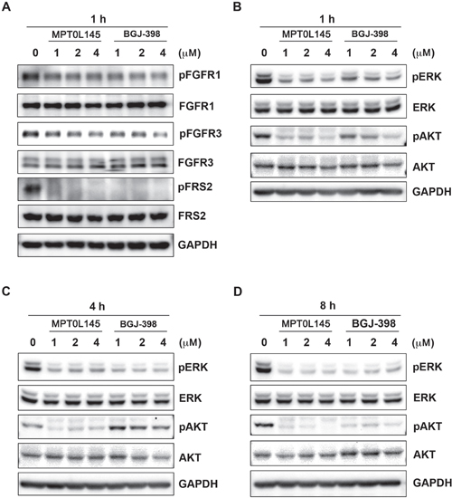 Figure 2: Inhibition of FGFR signaling by MPT0L145 in RT-112 cells. A. RT-112 cells were treated with the indicated concentrations of MPT0L145 and BGJ-398 for 1 h and the levels of phosphorylated FGFR1, FGFR3 and FRS2 were detected via western blot. (B–D) Effects of MPT0L145 on FGFR downstream signaling. Cells were treated with the indicated concentrations of MPT0L145 or BGJ-398 for 1 h B. 4 h C. and 8 h D. Protein lysates were subjected to western blot analysis with the indicated antibodies.