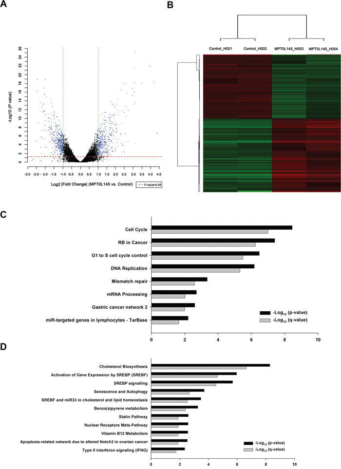 Figure 3: Differentially expressed genes and pathway analysis in MPT0L145-treated cells. RT-112 cells were treated with MPT0L145 (4 μM) for 8 h. Total RNA was extracted and subjected to cDNA microarray analysis. A. Volcano plot, B. Clustering, C. Pathway analysis for downregulated genes. D. Pathway analysis for upregulated genes.