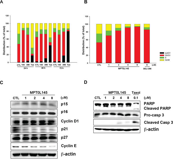 Figure 4: Effects of MPT0L145 on cell cycle distribution. A. RT-112 cells were treated with MPT0L145 (4 μM), BGJ-398 (4 μM) and Paclitaxel (0.1 μM) for the indicated times, and cell cycle distribution was analyzed via flow cytometry. (CTL: control group, 145: MPT0L145, 398: BGJ-398, Tax: Paclitaxel) B. RT-112 cells were exposed to the indicated concentrations of MPT0L145 and BGJ-398 (8 μM) for 24 h and subjected to flow cytometry. C. Effects of MPT0L145 on cell cycle regulator proteins. RT-112 cells were treated with different concentrations of MPT0L145 for 24 h and subjected to western blot. D. RT-112 cells were treated with MPT0L145 and Paclitaxel for 72 h. Apoptosis was assessed via detection of cleaved caspase-3 and PARP.